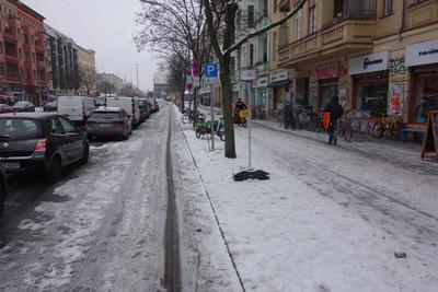 Das Bild zeigt die zugeparkte Ladezone vor unserem Geschäft und zusätzlich den nicht geräumten und völlig vereisten Radweg. Auf dem Weg zur Arbeit heute morgen war kein einziger der von der Straße separierten Radwege geräumt.