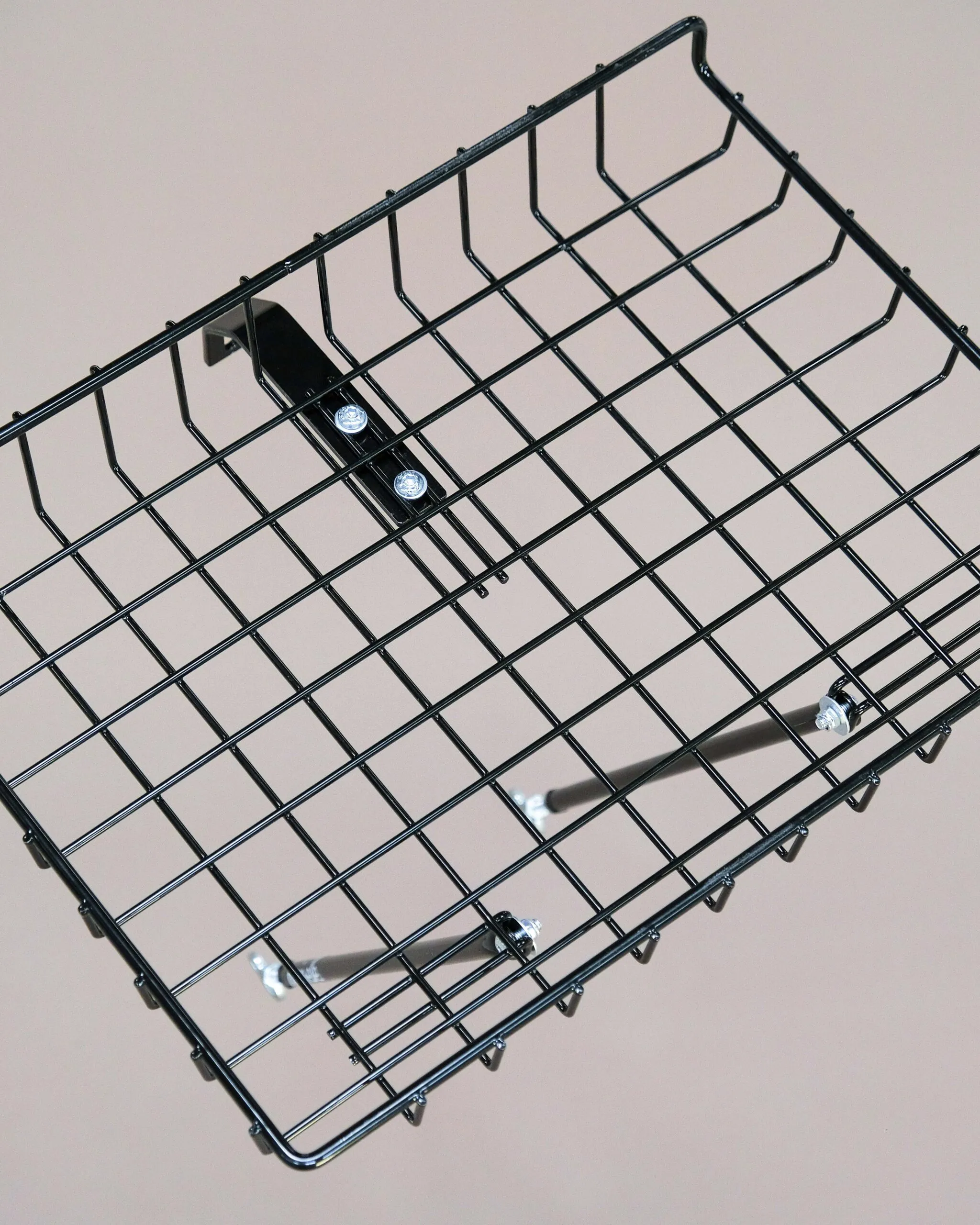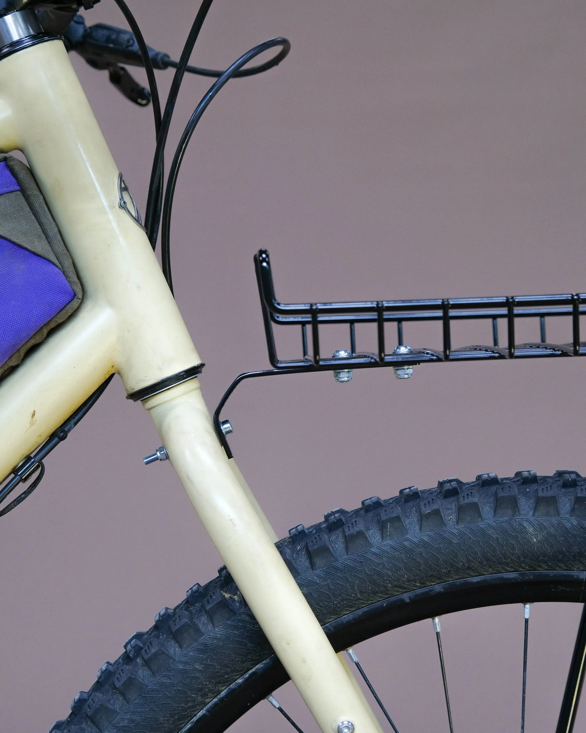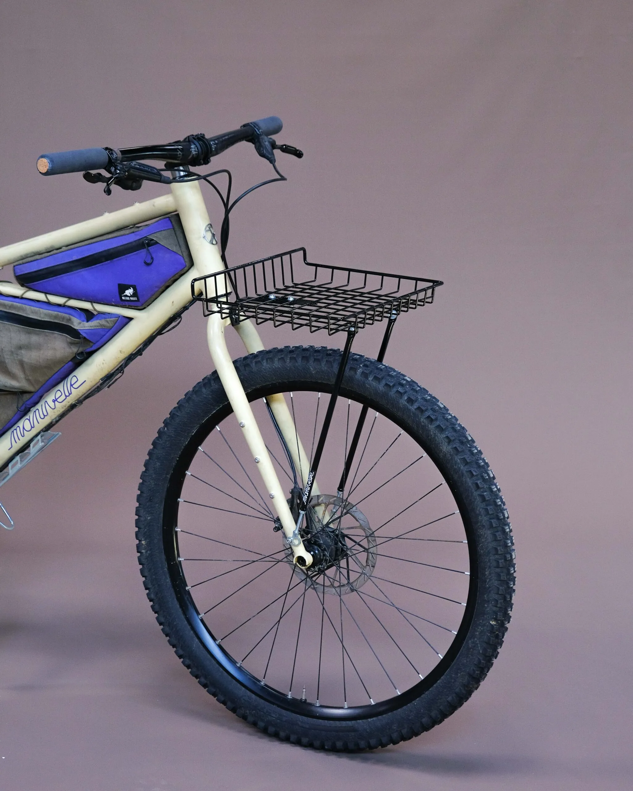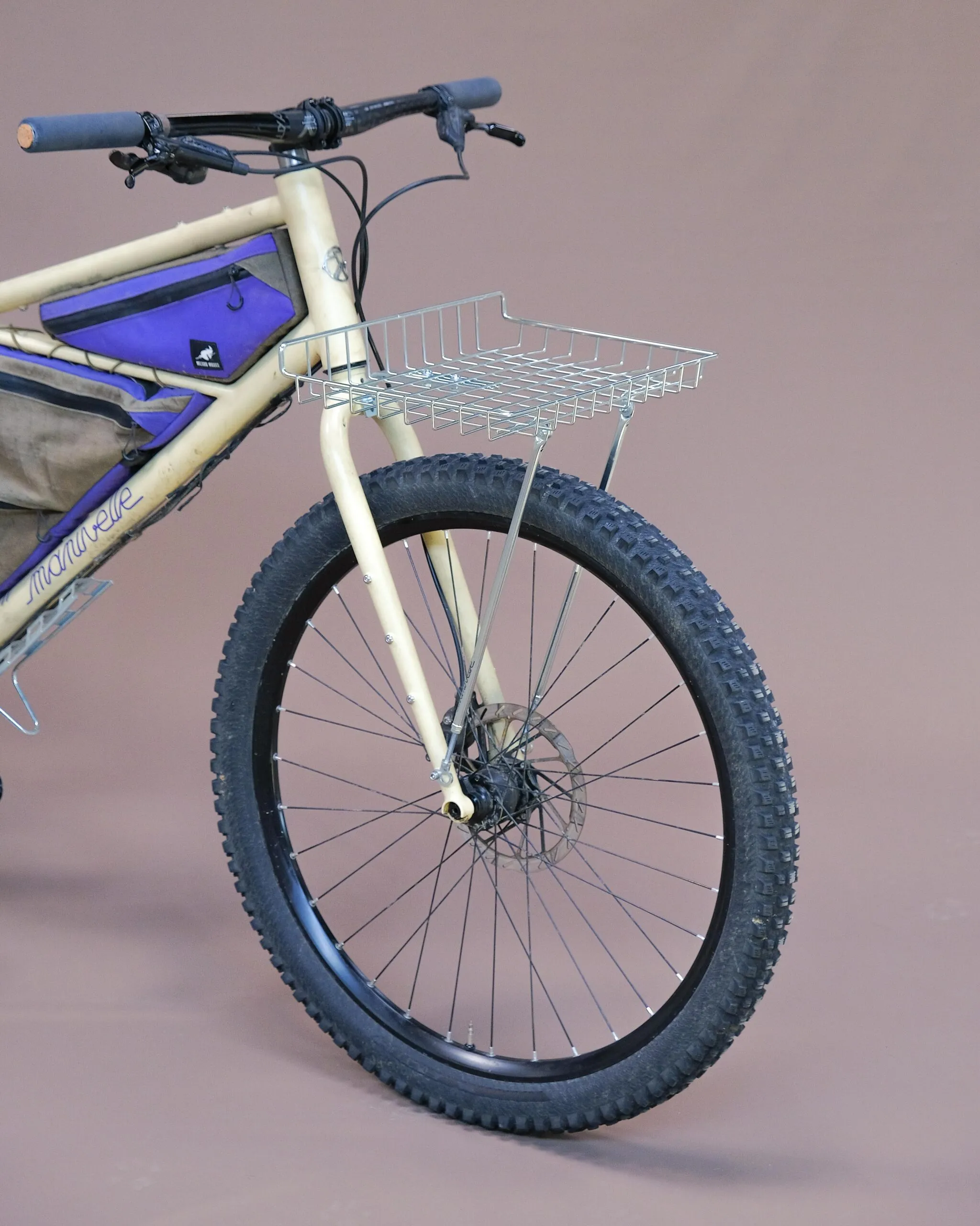 Cycles Manivelle aus Straßburg lässt diesen Gepäckträger in Frankreich von einem Hersteller für Einkaufswagen produzieren. Das Konstruktionsprinzip entstammt einem Einkaufswagen, – mit entsprechender Stabilität. Die Befestigung erfolgt an der Bohrung der Gabelkrone, zwei Streben zum Ausfallende des Vorderrads stützen den Korb zusätzlich ab. Maximal Belastung ist 10 kg!
